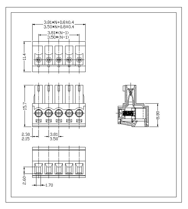 ·材质及电镀 触点材料 : 磷青铜 螺丝 :M2 钢 镀锌 方块:黄铜,镀镍 塑 件 : PA66 UL94V-0 ·电气性能 额定电压: 300V 额定电流: 8A 接触电阻: 20mΩ 绝缘电阻: 5000MΩ/1000V 耐电压: AC1500V/1Min 使用线径: 28-16AWG 1.5mm²