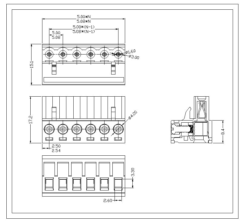 ·材质及电镀 触点材料 : 磷青铜 螺丝 :M2.5 钢 镀锌 塑 件 : PA66 UL94V-0 ·电气性能 额定电压: 300V 额定电流: 15A 接触电阻: 20mΩ 绝缘电阻: 5000MΩ\1000V 耐电压: AC1500V\1Min 使用线径: 28-12AWG 2.5mm²·机械性能 温度范围: -40℃~+105℃ 瞬时温度: +250℃ 5秒 扭力:0.5Nm(4.5lb.in) 剥线长度:7-8mm